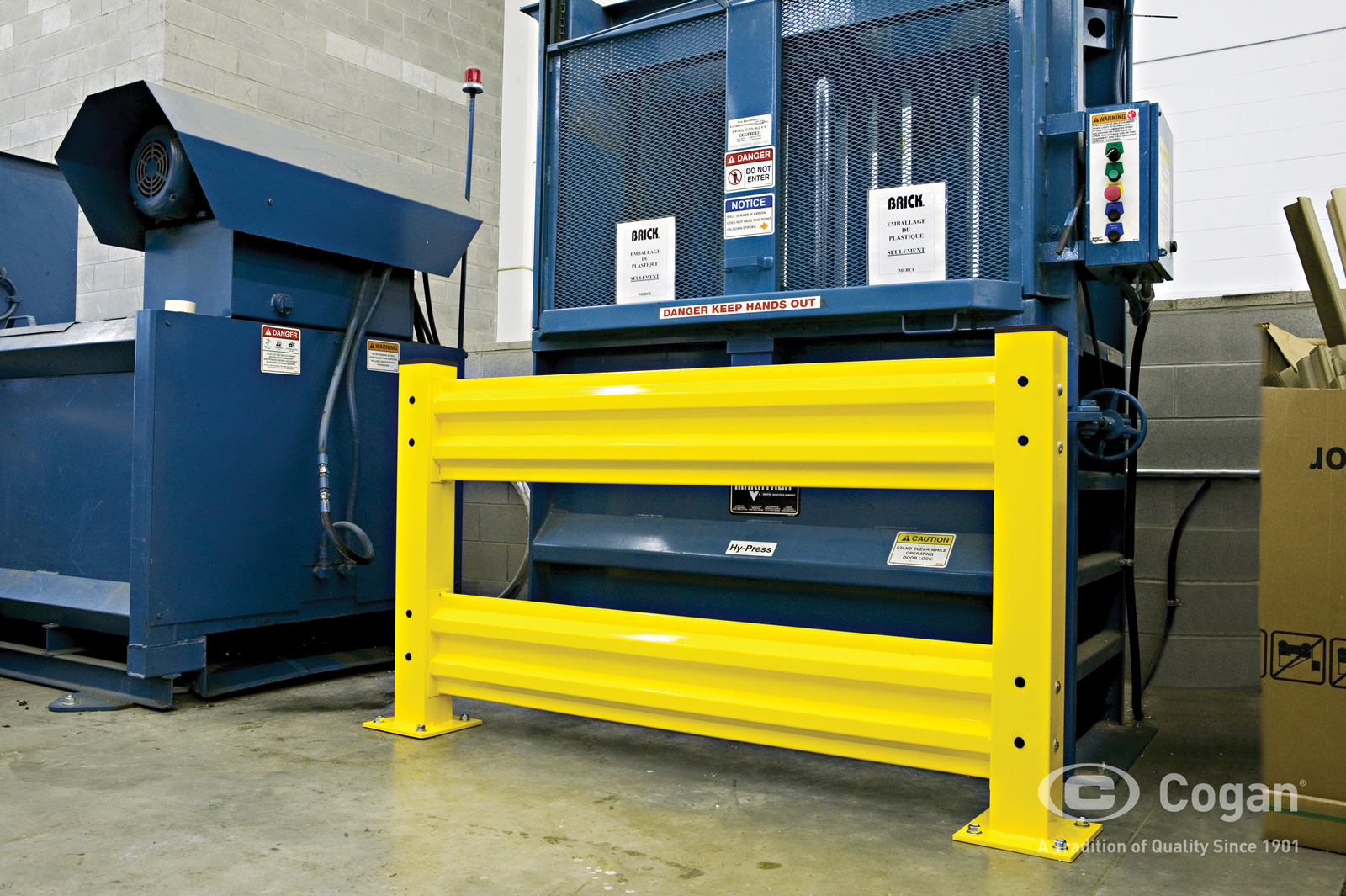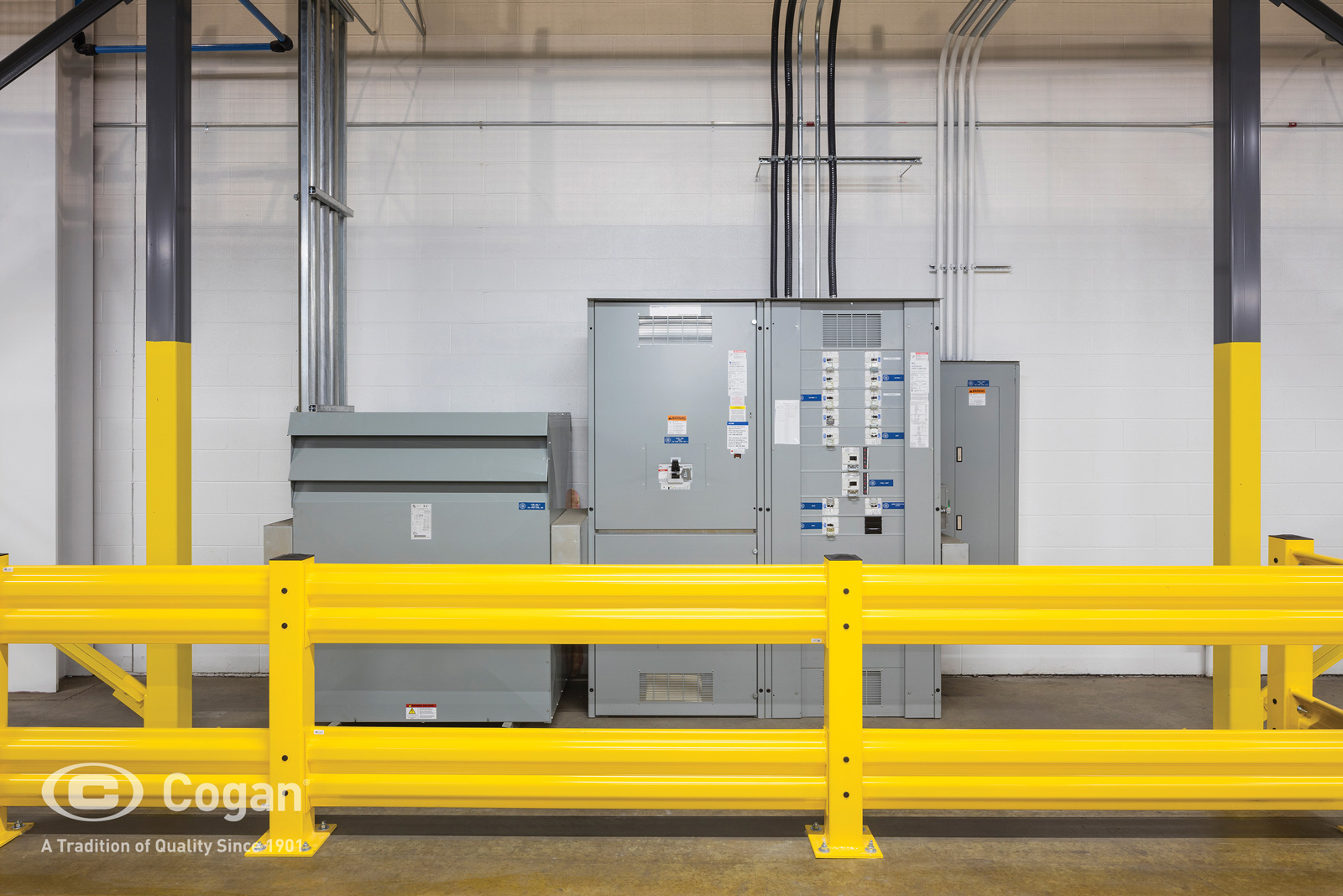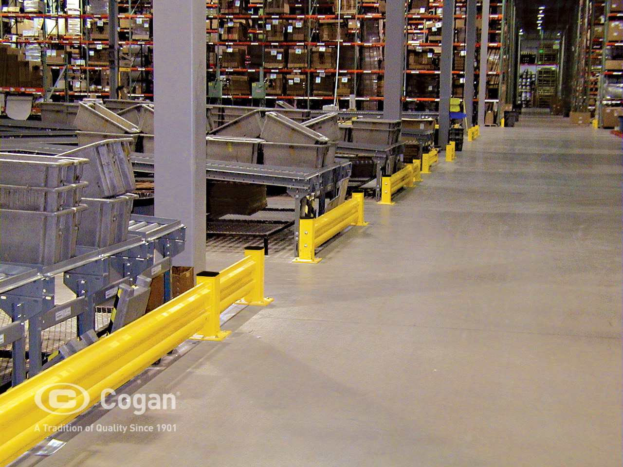 Guardrails serve to control traffic patterns by directing pedestrian flow while preventing forklift encroachment into designated walkways. Depending on required protection levels, systems may be configured as single-rail, double-rail, or reinforced multi-rail assemblies. Cogan’s bolt-on design allows for easy installation and provides the flexibility to expand or reconfigure as facility needs evolve.