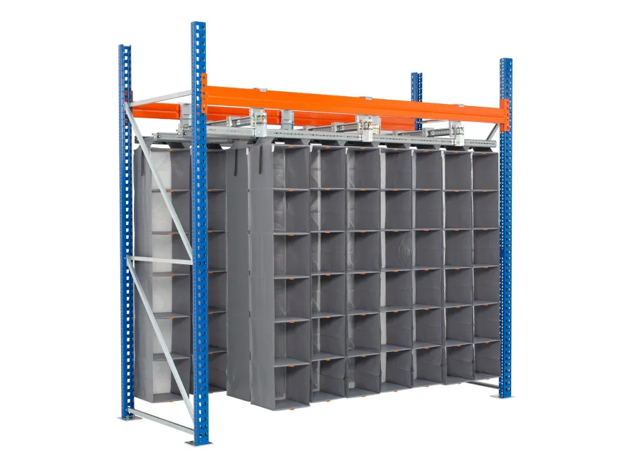 Storeganizer optimizes warehouse storage costs per square foot (meter) by using suspended, easy-to-reach columns divided into multiple compartments/pockets.